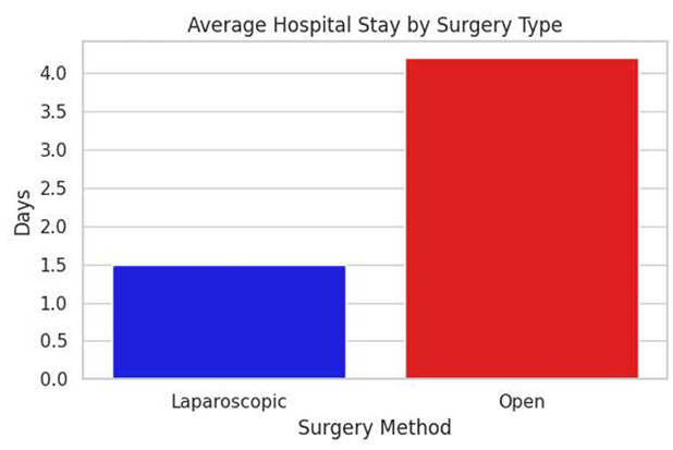 The above chart shows a comparison between the length of stay of patients after laparoscopic surgery and open surgery. As can be seen, patients undergoing laparoscopic surgery are hospitalized for an average of about 1.5 days, compared to more than 4 days for open surgery. This is not only beneficial for the patient's health, but also more economically viable for the health care system.