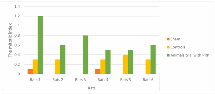 From the results of the study, the mean mitotic index in rats that were not given PRP was 0.26. The average mitotic index in rats that were given PRP was 0.26. PRP is almost twice the average of non-PRP rats, which is 0.7. The mitotic index of rat hepatic tissue that was not subjected to hepatectomy is shown, where the mitotic index is found to be the smallest compared to the resected hepatic tissue compared to the resected hepar (Tables 2,3).