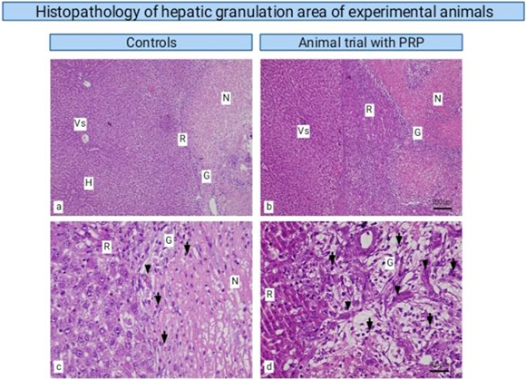 Figure 2: Photomicrograph of hepatic tissue of experimental animals at the post-hepatectomy margin area showing post-hepatectomy necrosis area, (N) hepatocyte regeneration area (R), and granulation tissue (G). Granulation tissue contains fibroblast cells, scattered leukocytes (↓) and neovascularization (?). Post-hepatectomy positive control animals (a, c), Hepatectomy treatment with PRP administration (b, d). PRP administration showed larger granulation tissue area with higher leukocyte cell infiltration (↓), fibroblast proliferation and more blood vessels (?) than the control without PRP. Hematoxylin eosin. Top panel 100x original magnification. bottom panel 400x original magnification.