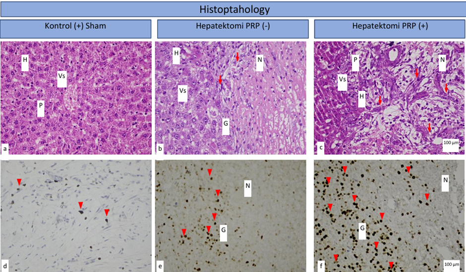 Methods: This study was an In Vivo experimental study using 18 rats, which were divided into 3 group, negative control (sham procedure), positive control (hepatectomy was performed but PRP was not given) and the treatment group (hepatectomy was performed and PRP was given). Observation of the condition of the liver was carried out histopathological in Laboratory.